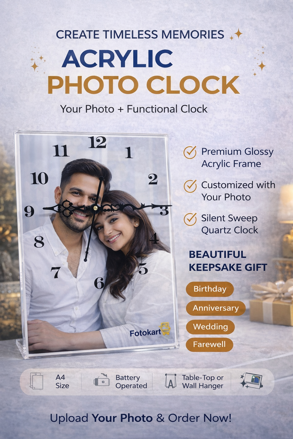 Turn your precious moments into timeless dΓ©cor with our Acrylic Photo Frame with Clock β€” a perfect blend of modern design and personal touch. Made with high-quality crystal-clear acrylic, this frame beautifully showcases your favorite photo along with an elegant built-in clock, making it ideal for homes, offices, and gifting.